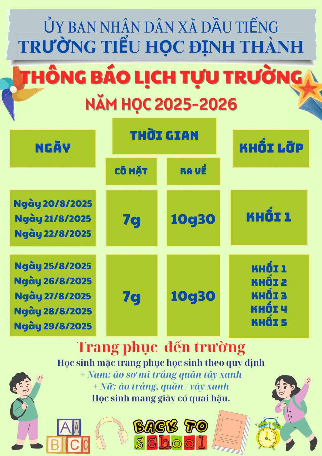 Trường Tiểu học Định Thành xin thông báo Lịch tựu trường năm học 2025-2026 đến CMHS.